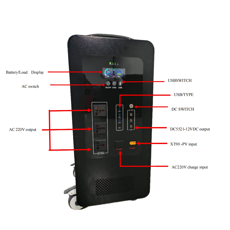 - Разрядная мощность переменного тока 220 В: непрерывная выходная мощность 3 кВт; зарядка переменного тока 220 В: 1000 Вт 5 А.